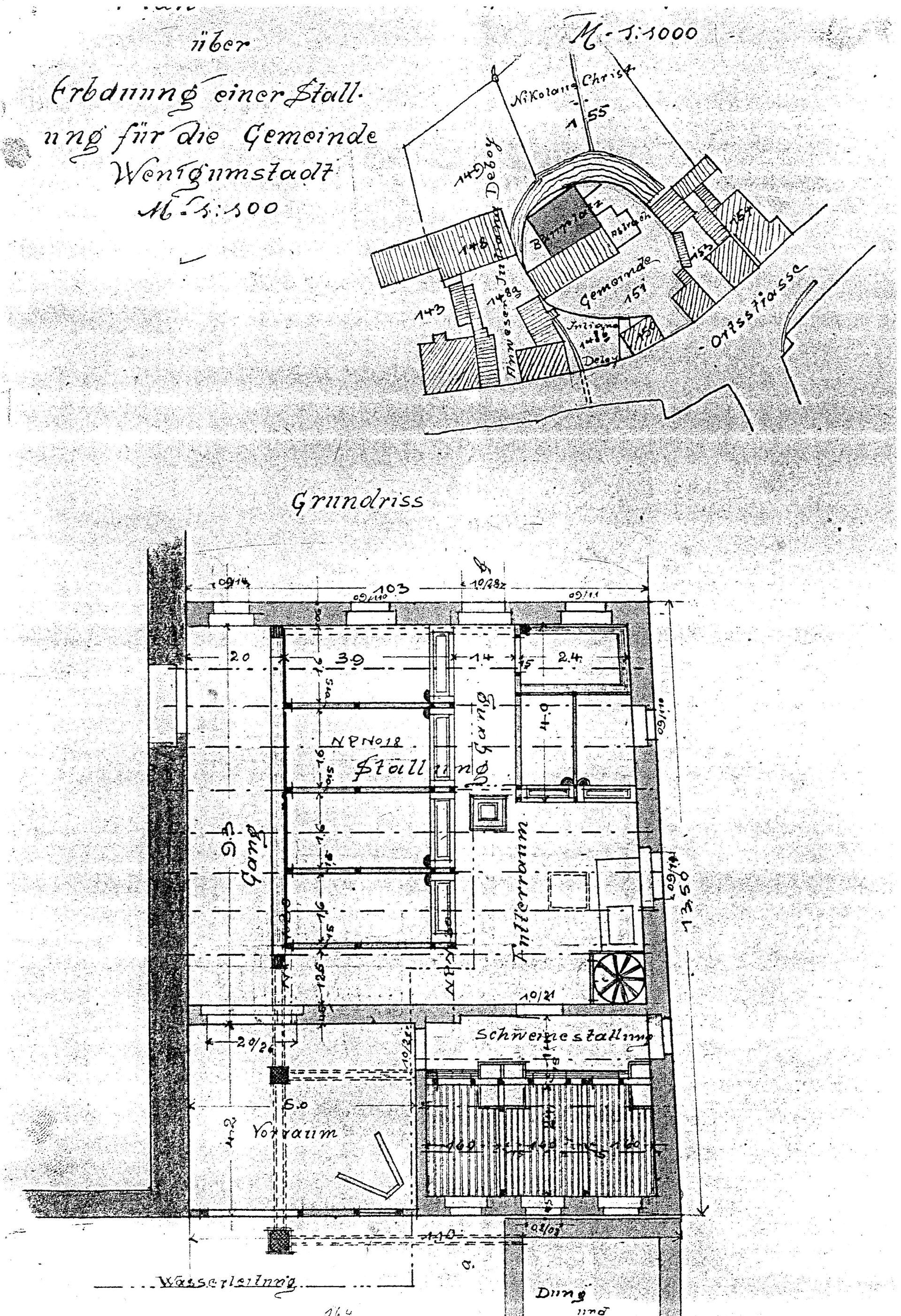 Aber damit war die Sache noch lange nicht erledigt. Denn bald war ein neuer Vorschlag da: ein Anbau an die Kirche auf dem „Kirchhof“. Den Grundriss dieses geplanten Gebäudes zeigt das dunkel gezeichnete Rechteck auf dem Lageplan. Der Bauplan war schon in allen Einzelheiten ausgearbeitet und ist noch heute einsehbar. Dieses Vorhaben war zwar nicht grundsätzlich verboten, doch das Bischöfliche Ordinariat in Würzburg äußerte in einem Brief an das Pfarramt erhebliche Bedenken: „Wenn auch die Bebauung eines aufgelassenen Friedhofs nicht verboten ist, so widerspricht es der Pietät gegen die Verstorbenen, auf einem Friedhofsgrunde einen solchen landwirtschaftlichen Bau aufzuführen, wie der in Wenigumstadt geplante. Es wird deshalb dem Pfarramte nahegelegt, die Gemeinde daran zu erinnern, daß die Umfriedung der alten Kirche ehedem „Gottesacker“ geheißen hat, auf welchem die Vorfahren der jetzigen Generation als Samenkörner eingesenkt wurden für den Tag der Auferstehung. …“ Am Ende des Briefes wird das Pfarramt beauftragt, „von diesem unserem Schreiben der Gemeinde Kenntnis zu geben und dieselbe entsprechend zu belehren.“ Pfarrer Lichtenebert hat auch diesen Auftrag erfolgreich erledigt, und die Gemeinde hat ihr fertig durchgeplantes Vorhaben nicht umgesetzt.